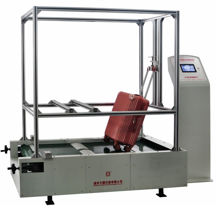FXB621箱包行走試驗(yàn)機(jī)(B法)通過傳送帶式檢驗(yàn)法,模擬人們出行拖動(dòng)箱包行走于地面,通過不同的顛簸板進(jìn)行行走沖擊。檢測(cè)在一定的行程后行走輪的磨耗量及是否損壞。