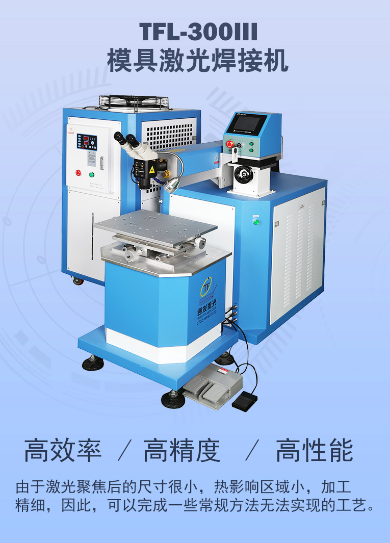TFL-300Ⅲ型模具激光焊機(jī)是通發(fā)激光公司自主研發(fā)的一款大功率激光焊接機(jī),采用通發(fā)自主研發(fā)的二代精密雙燈電源為燈泵浦驅(qū)動(dòng)電源,配置觸摸屏,操作更方便。主機(jī)具備激光頭手搖升降與工作臺(tái)按鈕電動(dòng)升降實(shí)現(xiàn)焊接不同厚度模具的激光焊加工。本款機(jī)型更適用于各類大功率、大面積激光修補(bǔ)的模具。由于激光功率大,同時(shí)可激光焊接鈹銅模具,鋁材模具或鋁材零件。在大面積激光修補(bǔ)模具時(shí),可以使用更粗的焊絲,激光焊接效率大幅提升。